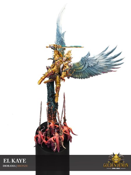 Darle altura a las miniaturas es siempre un buen enfoque y gana puntos y aquí tenemos una miniatura que lo hace perfectamente además de presentar una muy buena pintura de la miniatura alada en el dorado y en las alas.