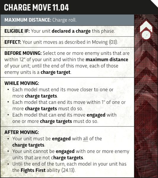 En la nueva edición, eliges los objetivos de tu carga DESPUÉS de tirar los dados, y cualquier unidad puede declarar una carga siempre que haya al menos una unidad enemiga a menos de 12 pulgadas. Esto significa que suele haber muchas menos cargas totalmente fallidas en las que una unidad se queda parada al descubierto, especialmente si eres inteligente y posicionas tu unidad para tener múltiples opciones potenciales dependiendo de lo que tires los dados (incluida la opción de no cargar en absoluto, si lo prefieres).