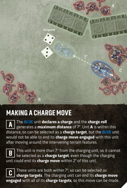 Mover las cargas también es un poco más permisivo. El objetivo de tu carga debe estar dentro de la distancia que obtuviste en la tirada, medida de base a base , y si puedes acercarte a una pulgada al mover una miniatura, debes hacerlo; pero si no puedes, solo necesitas moverla para estar dentro del alcance de combate. Esto significa que cargar doblando esquinas o adentrándose en el terreno se vuelve una tarea mucho más indulgente, ya que tu unidad solo necesita llegar a 2 pulgadas del enemigo.
