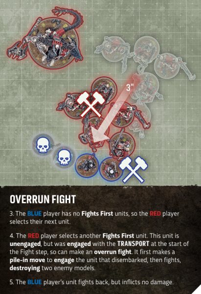 A veces, en combates con muchas unidades involucradas, tus tropas podrían encontrarse con que las miniaturas con las que estaban luchando ya han muerto cuando les toque atacar. No temas: si están listas para luchar, pero no están en combate, pueden realizar un ataque especial de arrollamiento que les otorga un segundo movimiento de Agrupación antes de elegir sus nuevos objetivos.
