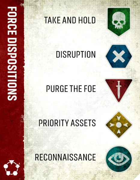 Cada disposición de fuerza está orientada a los objetivos temáticos de la misión, por lo que un ejército que elija Purgar al enemigo a menudo obtendrá puntos de victoria por aniquilar unidades enemigas, mientras que uno que opte por Interrupción podría necesitar realizar acciones en territorio enemigo o mientras ocupa áreas cruciales del terreno.