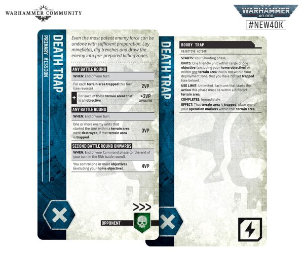 Las cartas de despliegue resultarán familiares para los jugadores habituales, con configuraciones clásicas como Amanecer de la Guerra, Martillo y Yunque y Punto de Inflexión. Cada par de misiones también incluye tres diseños de terreno recomendados con despliegues específicos, diseñados para ofrecer a ambos jugadores un campo de batalla equilibrado. Sin embargo, también puedes crear tus propios diseños para adaptarlos a tu colección de terrenos.