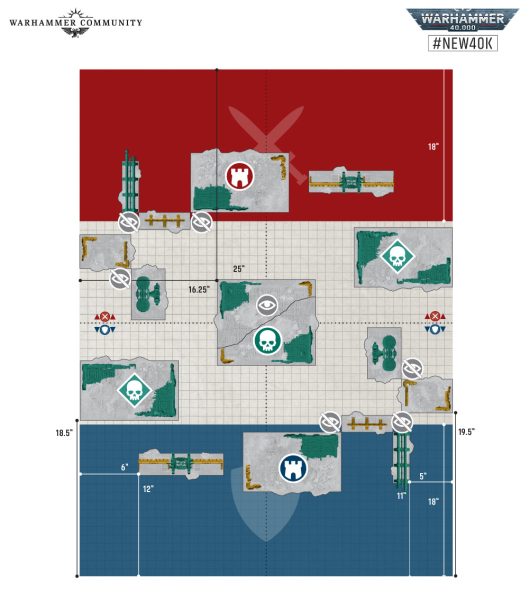 En nuestro diagrama, estas zonas están representadas por barricadas y generadores de campo del Mechanicus, pero puedes rellenarlas con el terreno que mejor se adapte a tu colección: ¿prefieres árboles? ¿Ruinas? ¿Extrañas formaciones xenos? Puedes diseñar tu campo de batalla a tu gusto, incluso utilizando estos diseños aprobados para torneos, lo que garantiza que tus partidas luzcan espectaculares y cuenten una historia fascinante.