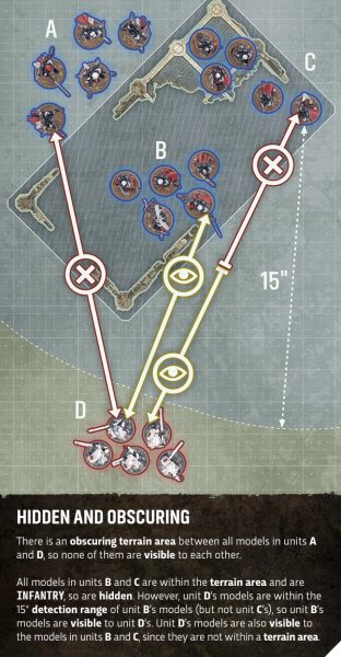 Entre estos cambios, destaca la incorporación de la regla Oculto . Las miniaturas de Infantería, Bestia y Enjambre dentro de un área de terreno pueden estar Ocultas siempre que su unidad no haya disparado en el turno actual o anterior del jugador (y, por lo tanto, estarán ocultas al comienzo de la partida). Mientras están ocultas, las miniaturas solo son visibles para las unidades enemigas dentro de su rango de detección, que suele ser de 15 pulgadas, lo que permite desplegarlas con mucha más libertad sin preocuparse por un bombardeo en el primer turno.
