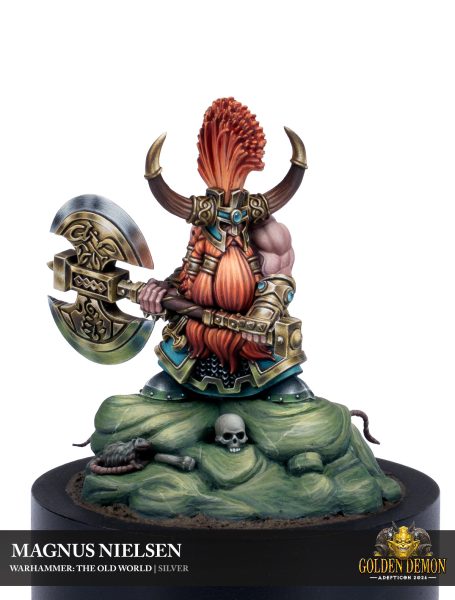 Un matador es de las habituales en esta categoría porque sus musculos, su salvajismo y sus pelos dan seguramente mucho juego a los pintores. El metal de esta armadura reluce que parece casi reglejar y ser un espejo y me encanta y luego el degradado por ejemplo en su enorme barba y pelo de matador es realmente imnotizante.