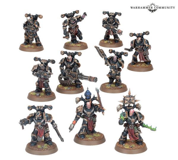 Los Legionarios de Marines Espaciales del Caos permiten montar una unidad de 10 temibles Astartes Herejes con 18 opciones de cabeza, 22 hombreras intercambiables, una variedad de armas especiales y pesadas, y suficientes piezas para equipar a la escuadra tanto para combate a distancia como cuerpo a cuerpo.