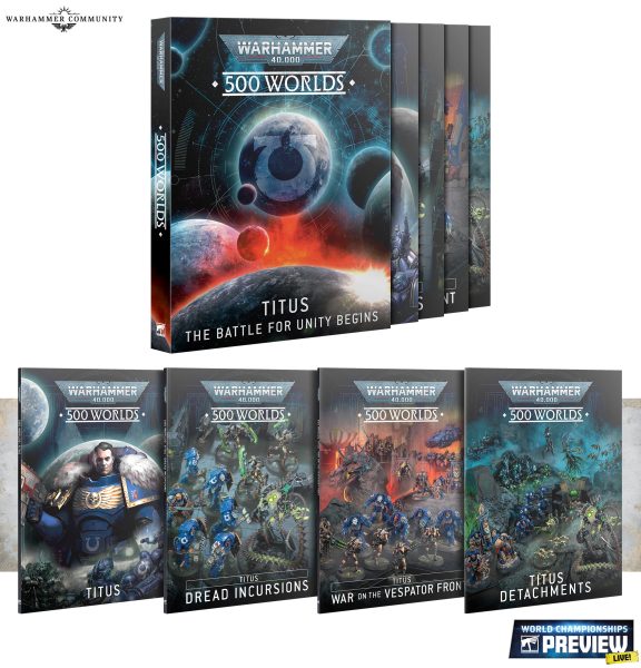 Presentado como un conjunto de cuatro libros encerrados en una caja decorativa, 500 Mundos: Titus cuenta la historia de la Reclamación Ultramariana y el asediado Frente Vespator, donde Titus y la Segunda Compañía de los Ultramarines están inmersos en una lucha desesperada contra una fuerza Necron plagada de la maldición del Destructor.