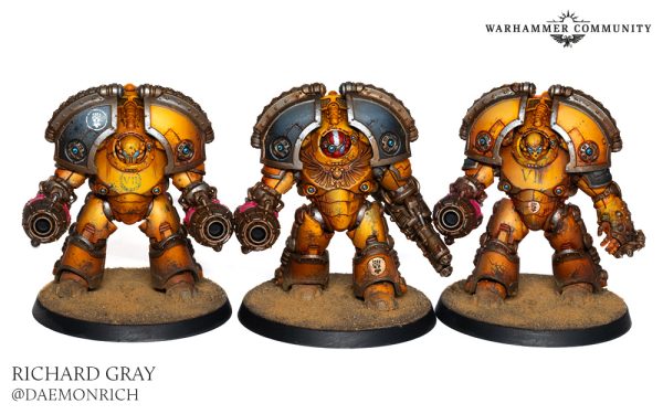 Los Puños Imperiales son amarillos pero puede haber muchos tonos y formulas de aplicar ese amarillo. Aquí los tenemos con una tonalidad de luces y sombras más bien anaranjadas y esas hombreras cambiantes o diferentes hacen que cada uno de estos Saturnine sea único. Una buena idea de personalización de miniaturas.