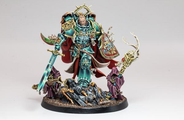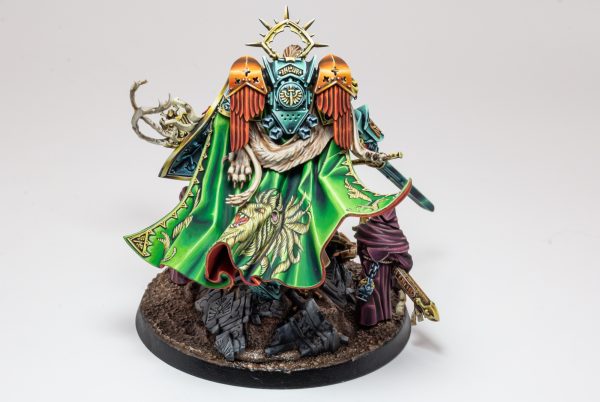 Y otro miniaturón es sin duda el primarca de los Angeles Oscuros. Y nos salimos de los clásicos colores blancos, verdes o rojos para un color mucho más cláro de la armadura que esta inmejorable en sus reflejos y luces y una capa que es para aplaudir sin parar al pintor.
