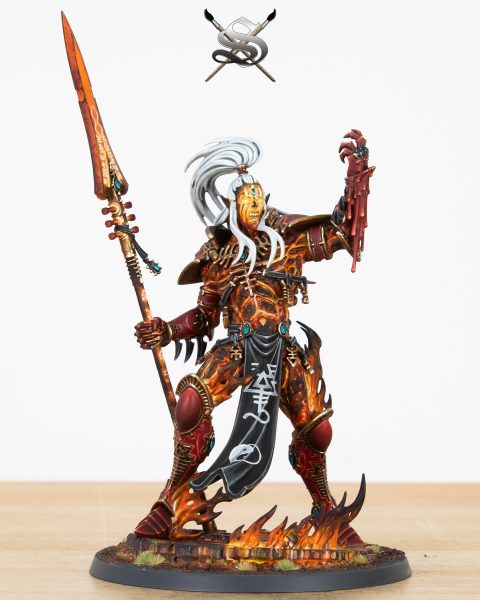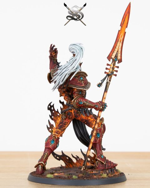 Subimos mucho la calidad y dificultad del pintado con este avatar de los aeldari. Con unas formulas de pintar fuego muy realistas y unos toques allí y alla que lucen mucho ya una maravillosa miniatura.