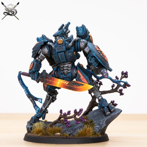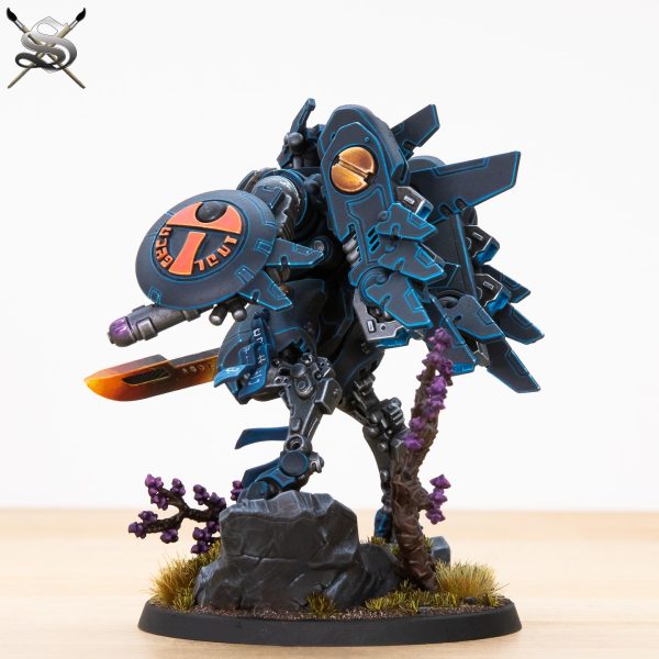 Aquí nos fijamos en esta Armadura Tau donde hay un muy bien conseguido perfilado en la armadura dando al negro de base un color mucho más bonito y atractivo y luego esa espada dorada es una preciosidad a quizás copiar en vuestras miniaturas propuas. Y una peana muy bien trabajada.
