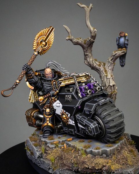 Ahora tenemos un capellan que sin duda en este pequeño diorama que se ha formado con esa trabajada peana ddestaca aun más. Toque especial a los bolter violetas que son un toque original y a los detalles por todos lados con el volumen sobre la moto, el pajarraco en el arbol, etc…