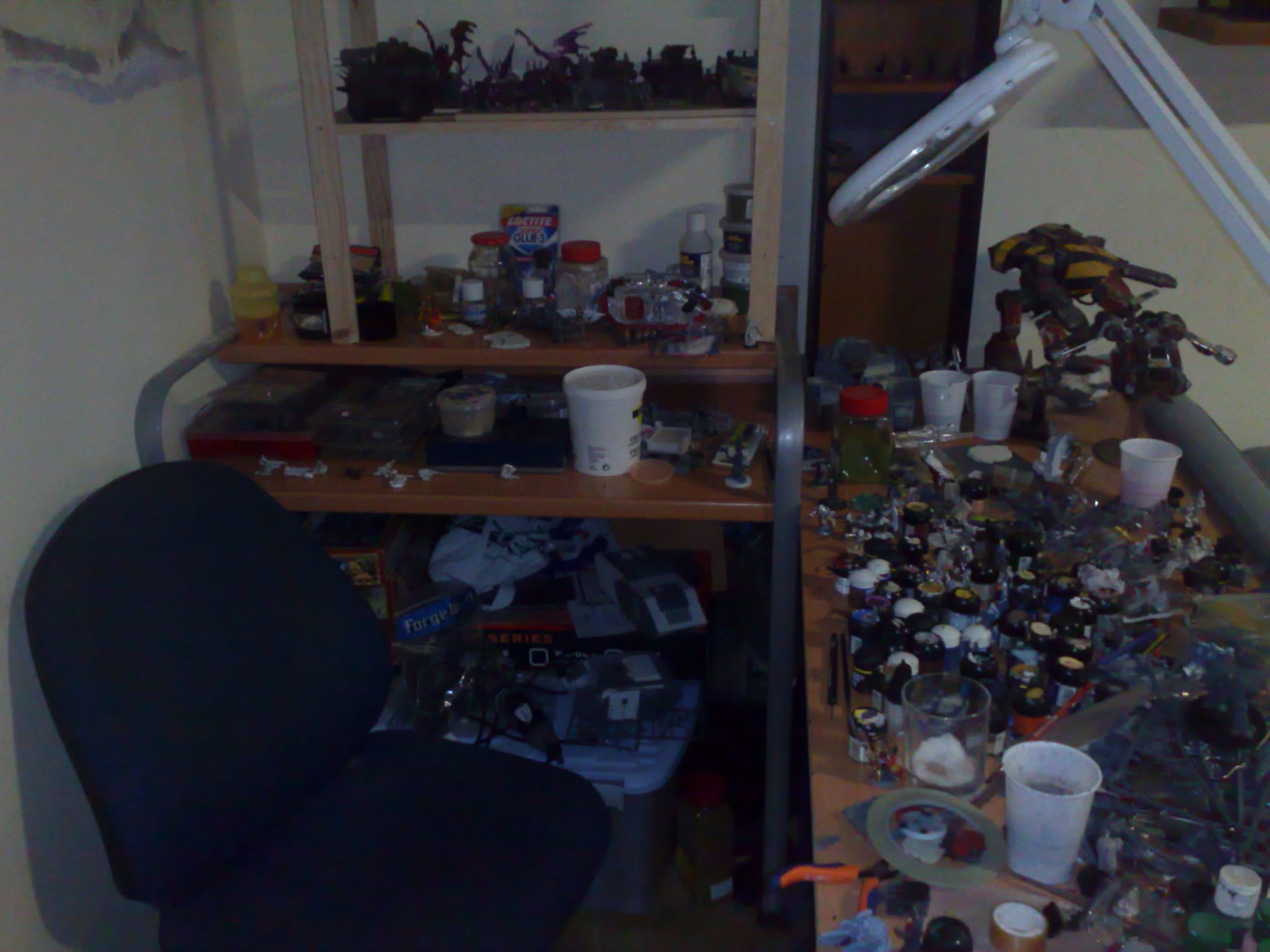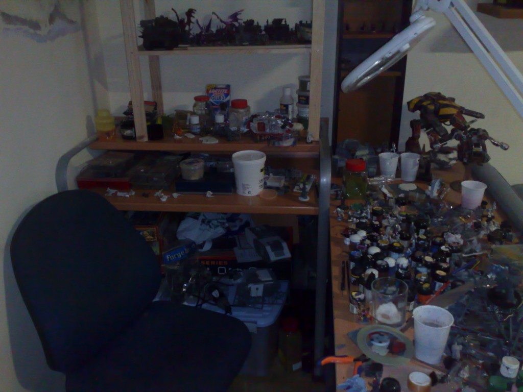 Como toda buena mesa de trabajo de Warhammer, muestra un «orden» que solo la persona que la usa conoce. Para el resto de mortales, seria un Caos, pero para él es su lugar sagrado. Todos tenemos nuestra mesa o rincon de trabajo y lo organizamos segun nuestras necesidades y forma de ser. Pero sinceramente no conozco a nadie que mantenga muy ordenada su mesa de trabajo. Somos asi verdad. Todo lleno de pinturas, restos y proyectos a medio hacer.
