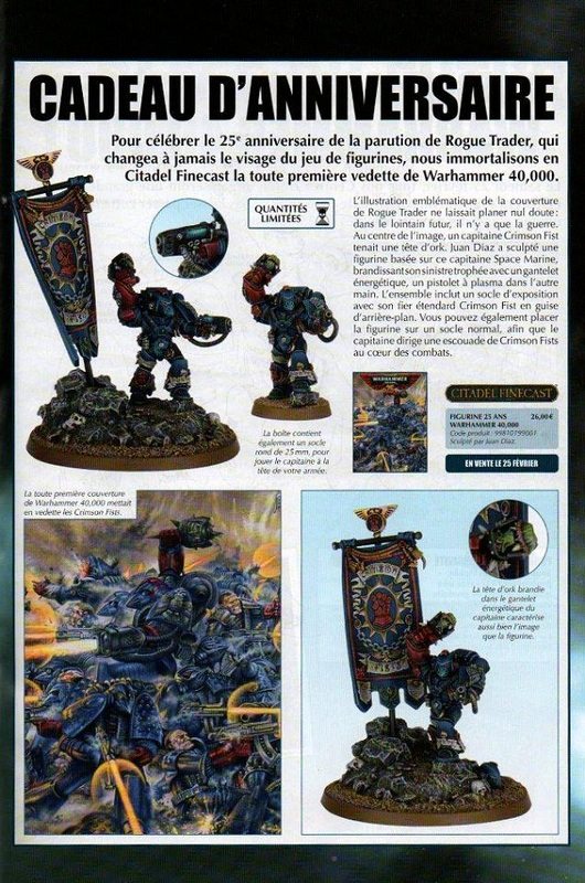 Con motivo de esta celebración sale esta mitica miniatura en Finecast a la venta este mes. Suponemos que sera por tiempo limitado o una cantidad limitada. Por lo menos al principio, porque despues intentaran hacer caja sacando más, como suelen hacer siempre. Es la miniatura portada de la primera caja de Rogue Trader, donde comenzo todo. De ahi la importancia de la miniatura y de haberla elegido para conmemorar este 25 aniversario.