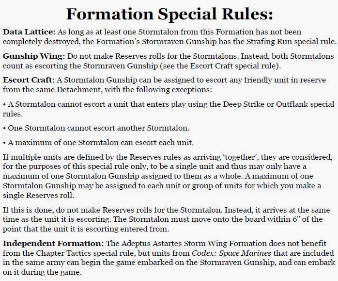Gunship Wing: No tiras por reservas para las Stormtalons. En cambio, ambas Stormtalons cuenta como escolta de la Stormraven Gunship (ver la regla especial Escort Craft).
