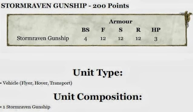 Independent Formation: La Formacion Adeptus Astartes Storm Wing no se beneficia de la regla especial Tácticas del Capítulo, pero las unidades de Codex: Marines Espaciales que se incluyen en el mismo ejército puede comenzar el juego embarcadas en la Stormraven Gunship, y puede embarcarse en ella durante el juego.