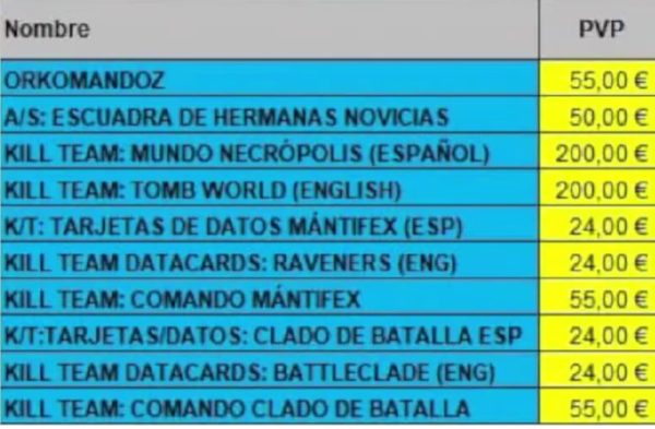 Todos lo Kill Team que salen a la venta por separado y las dos caja de antiguos Kill Team que pasan ahora a ser compras de Warhammer 40000 todo sale a 55 euros por caja salvo las hermanas de batalla que tienen un precio de 50 euros.